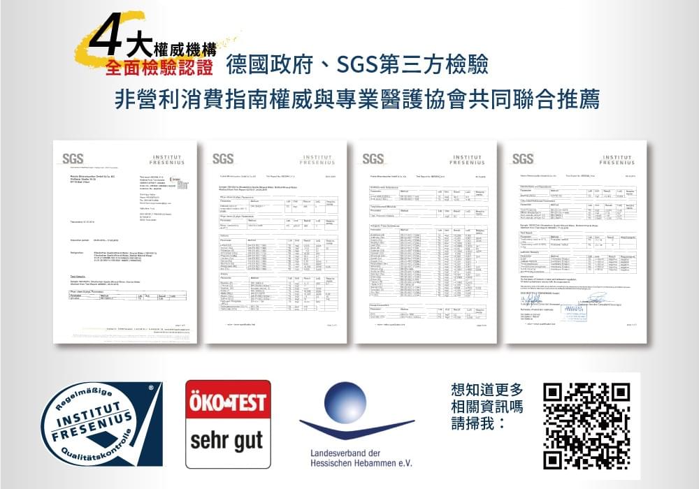 通過德國政府、SGS與 ÖKO-TEST奧科(鄂科)測試...等國家機構與第三方公正機構嚴格把關、檢測與監督的高品質天然礦泉水源,且外瓶包裝必須安全無化學藥劑、塑化劑等溶出疑慮。